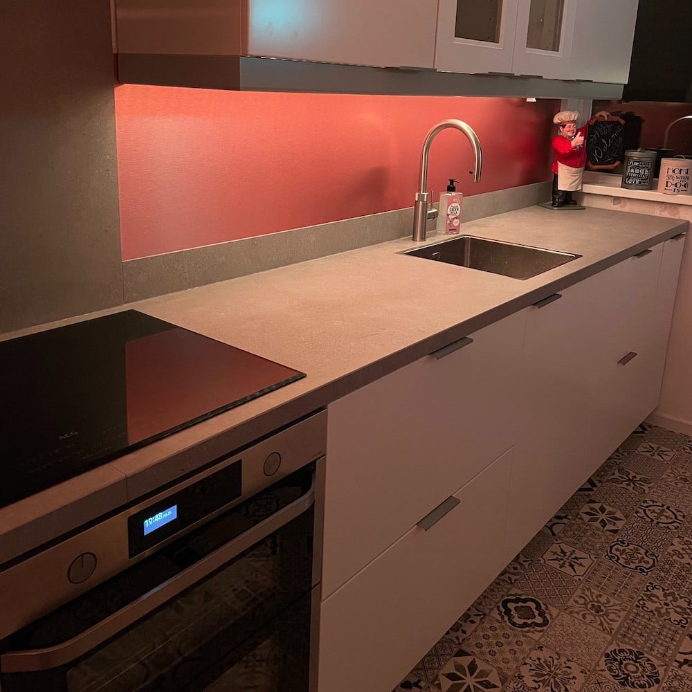 Marianne nadała swojej kuchni świeży i nowoczesny wygląd, decydując się na backsplash kuchenny z płyty warstwowej aluminiowej Alupanel w kolorze miedzianym. Wybrała tę wspaniałą płytę, aby ożywić swoją białą kuchnię z szarymi akcentami. A efekt? backsplash kuchenny stał się prawdziwą atrakcją, nadając jej kuchni niepowtarzalny charakter!