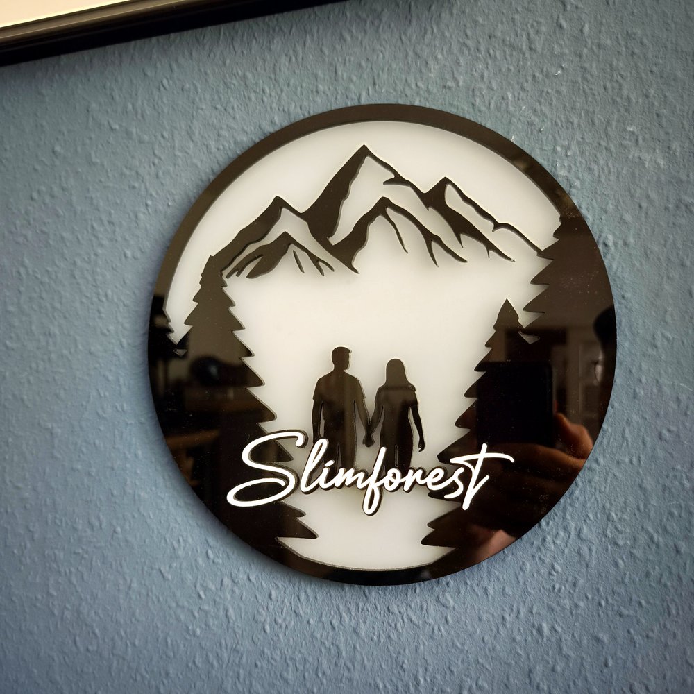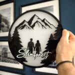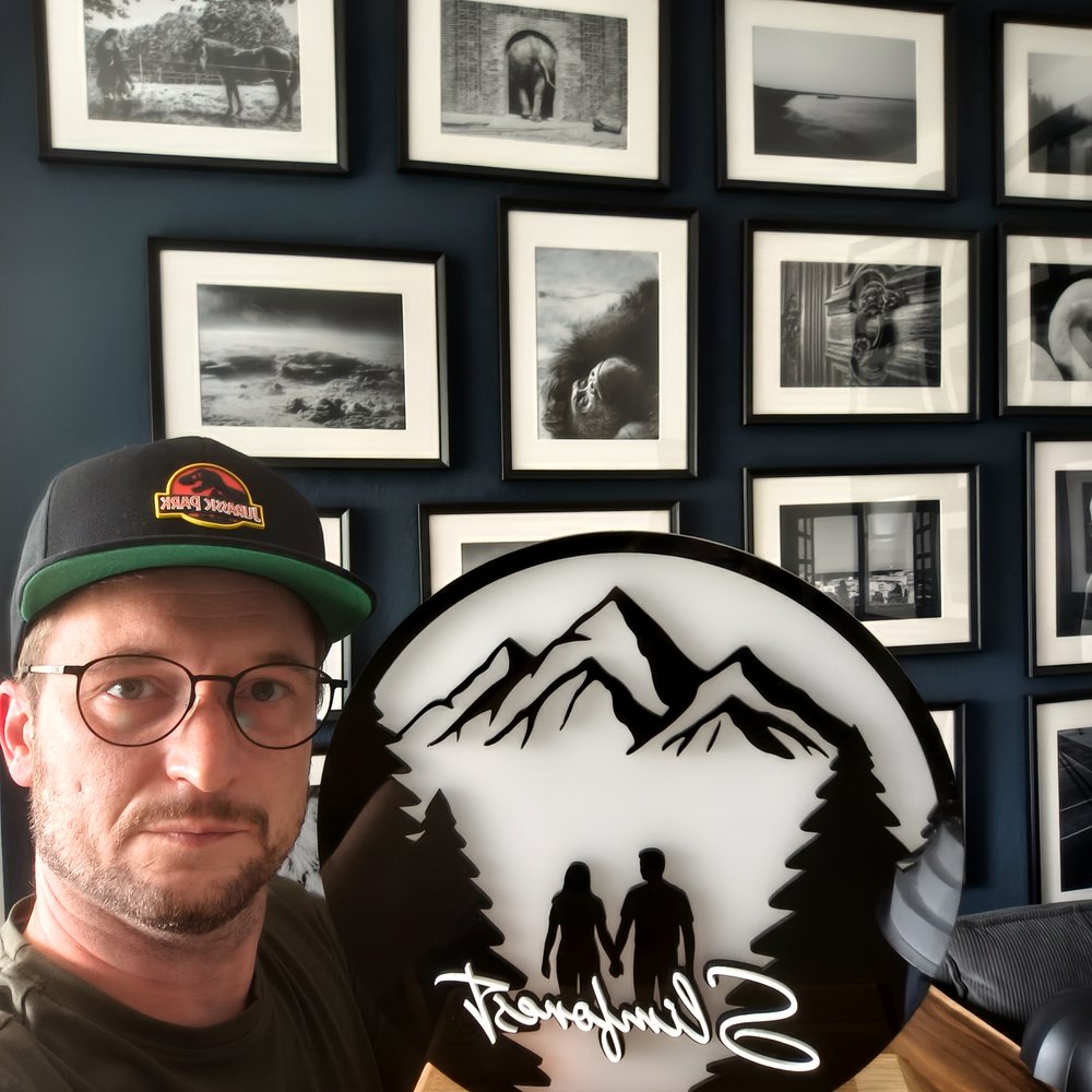 Christoph chciał znaleźć idealny prezent ślubny dla swoich przyjaciół, którzy uwielbiają piesze wędrówki. Wpadł na pomysł stworzenia dekoracyjnej tabliczki na ścianę i, aby uzyskać efekt głębi, zrobił ją z trzech warstw szkła akrylowego. W trakcie realizacji projektu postanowił również wykonać stojak z drewna dębowego. Dzięki temu przyjaciele mogą zarówno powiesić to dzieło sztuki na ścianie, jak i postawić je w dowolnym miejscu.