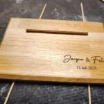 Tę dekoracyjną tabliczkę Christoph wykonał z trzech różnych rodzajów szkła akrylowego: matowego, czarnego i białego. Połączenie warstw za pomocą kleju stworzyło piękny efekt głębokości. Aby prezent pięknie wyglądał, Christoph wyciął z dębowego drewna stojak i wygrawerował na nim imiona młodej pary oraz datę ślubu. Dzięki temu stojakowi obdarowani sami mogą zdecydować, czy umieszczą tabliczkę w stojaku, czy powieszą ją na ścianie. Co więcej, jeżeli tabliczkę powieszą na ścianie, będą mogli umieścić w drewnianym stojaku jakieś zdjęcie.