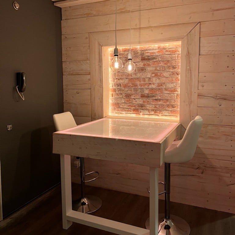 Niek stworzył unikalny stół z plexi z oświetleniem LED. Połączenie opalowego białego plexi i drewna konstrukcyjnego, w zestawieniu z solidną ceglaną ścianą i nastrojowym oświetleniem, daje imponujący efekt. Udało mu się zamienić prostą ścianę z zaledwie pięcioma półkami z Ikei w imponującą ozdobę swojego domu.