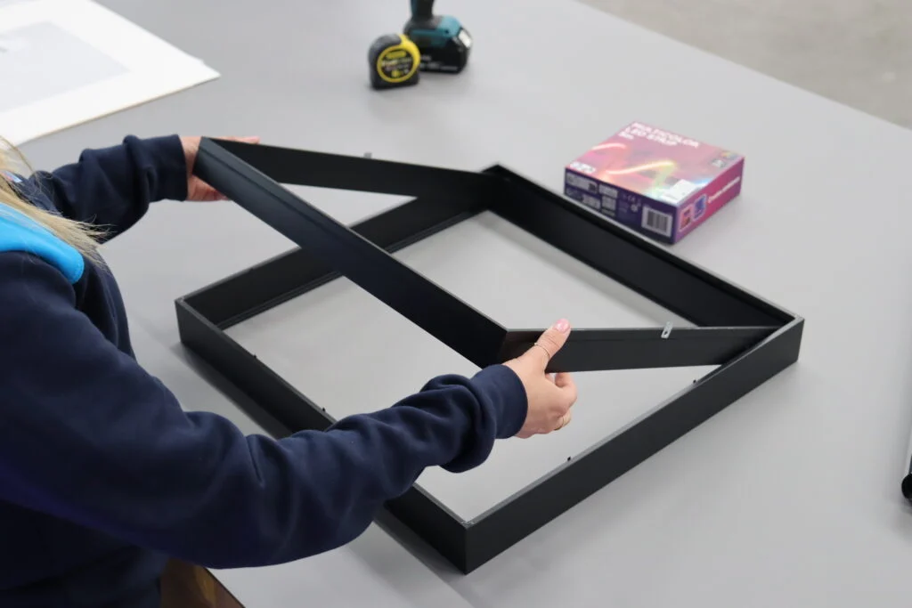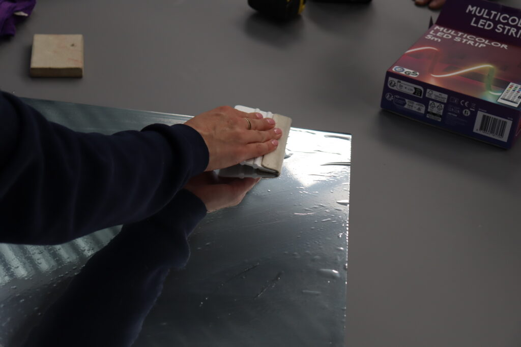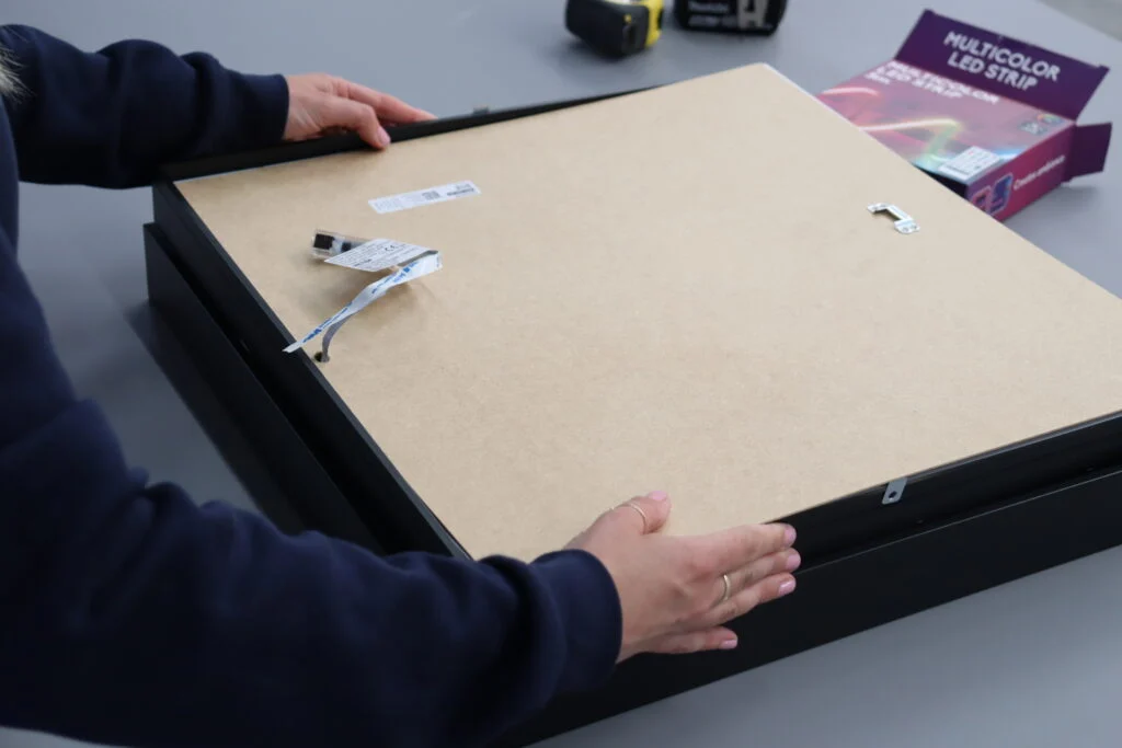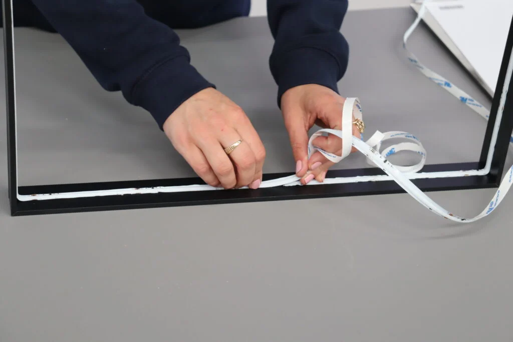 Rozpocznij od umieszczenia lustrzanej płyty plexi. Będzie ona „tyłem” ramy. Upewnij się, że jest dobrze położona. Następnie weź ramę z wcześniej umocowanymi na niej taśmami LED i umieść ją na płycie lustrzanej. Upewnij się, że taśmy LED dobrze przylegają i nie wystają poza krawędzie ramy. Następnie umieść jako przednią część konstrukcji, przeźroczystą płytę plexi z idealnie nałożoną na nią folią lustrzaną.