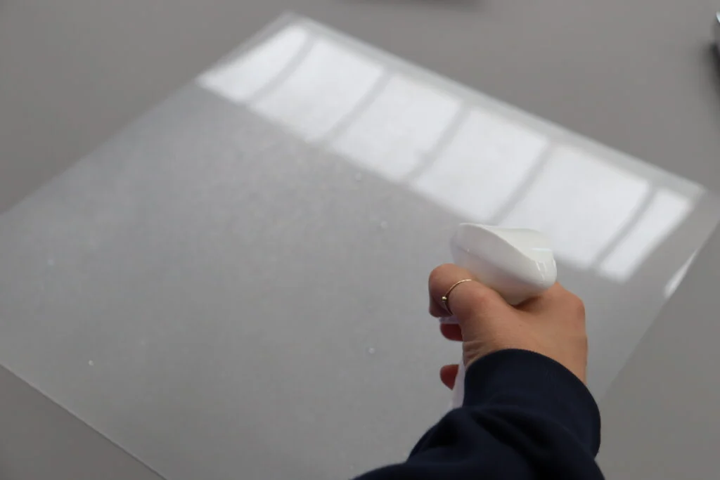 Weź półprzezroczystą folię lustrzaną i ostrożnie nałóż ją na wewnętrzną stronę swojej przeźroczystej płyty plexi. Zacznij od jednej strony i powoli przechodź do drugiej, wygładzając ewentualne pęcherzyki powietrza kartą do bankomatu. Upewnij się, że folia przylega równomiernie i jest dobrze naprężona, aby wykończenie było nieskazitelne.