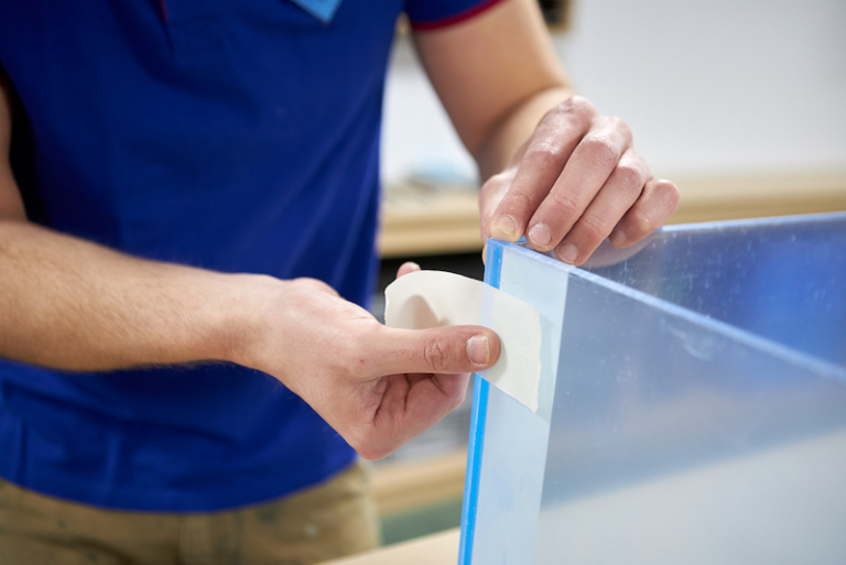 Czy dostarczono ci już twoje płyty plexi? Połóż je zatem na równej, odtłuszczonej powierzchni. Użyj miękkiej ściereczki, aby uniknąć zarysowań. Zdejmij folię ochronną z jednej strony i naklej taśmę malarską w odległości 8 mm od krawędzi płyty, aby klej nie poplamił plexi. Uważaj: używając kleju Acrifix, nie rozprowadzaj go, aby nie stworzyć mętnej powłoki. Dla uzyskania najlepszego rezultatu pozwól, aby klej spokojnie wysechł.