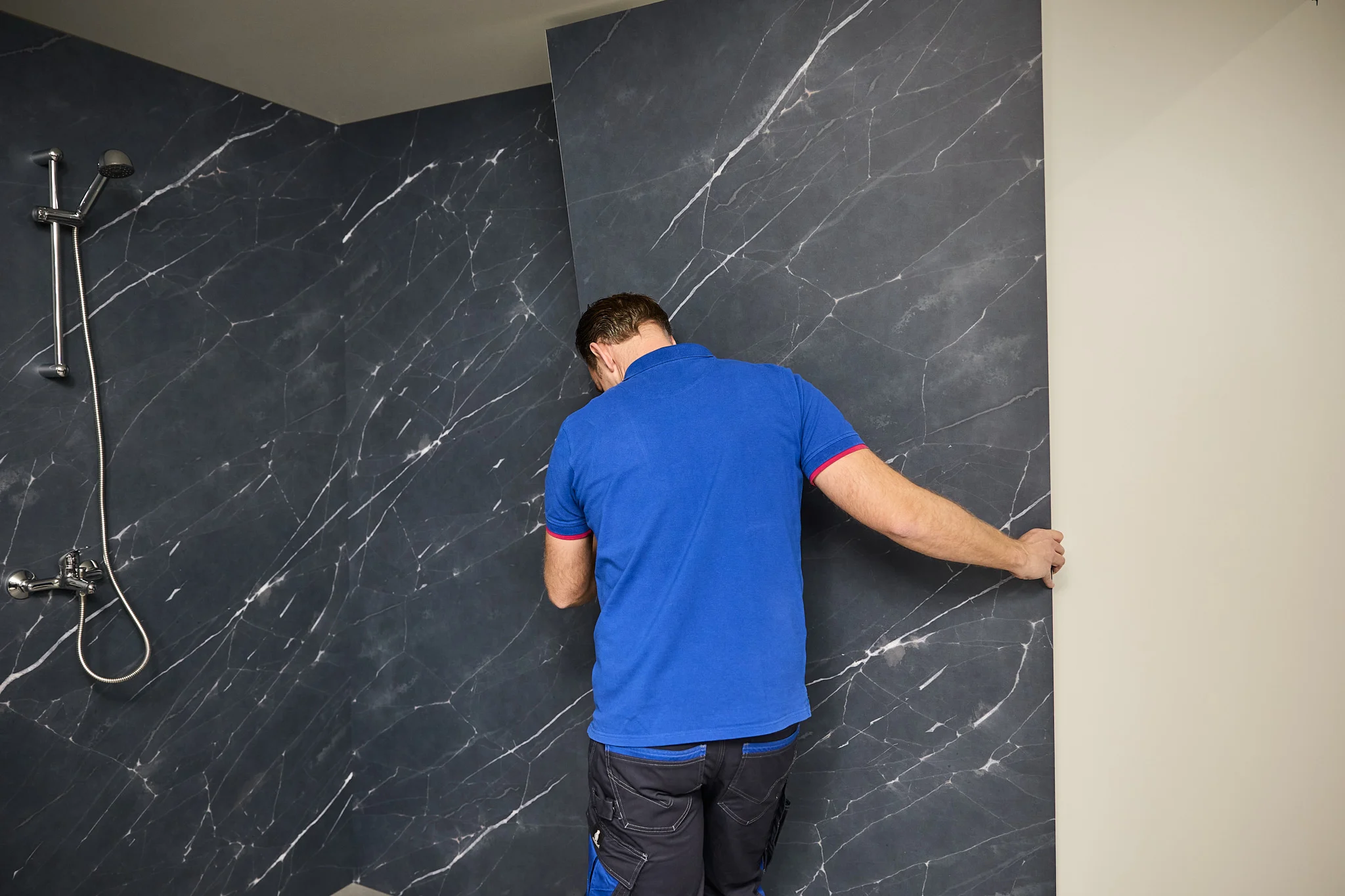 Przygotowanie kabiny prysznicowej należy zacząć od jej dokładnego wyczyszczenia. Upewnij się, że płytki są suche, niezakurzone i odtłuszczone, aby zapewnić ich dobrą przyczepność. Umieść panele ścienne w ich docelowym miejscu, aby sprawdzić, czy dobrze pasują. Następnie zdejmij folię ochronną z tylnej strony paneli i dokładnie odtłuść również tę powierzchnię, aby klej montażowy dobrze przywarł.