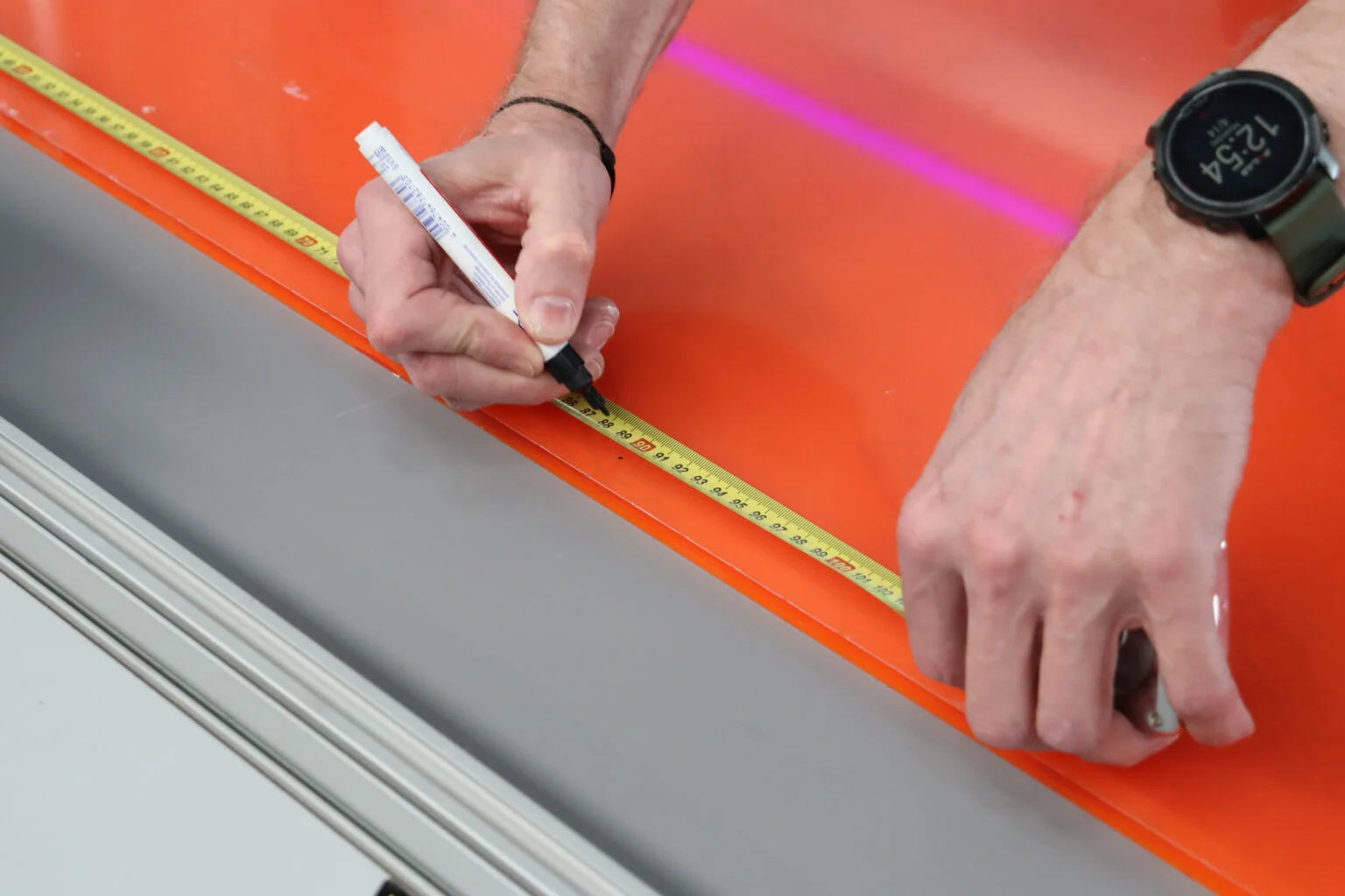 Najlepiej, gdy potykacz ma stabilny kształt litery A. Aby to osiągnąć, trzeba odpowiednio wygiąć plexi.Najpierw zaznacz linię zagięcia, aby potykacz był symetryczny. Znajdź środek płyty i zaznacz, gdzie ma być zgięcie. Do zaznaczenia linii gięcia wystarczy użyć zwykłej linijki i markera.