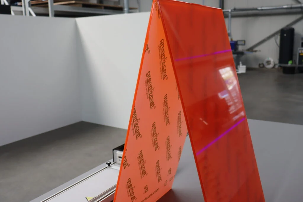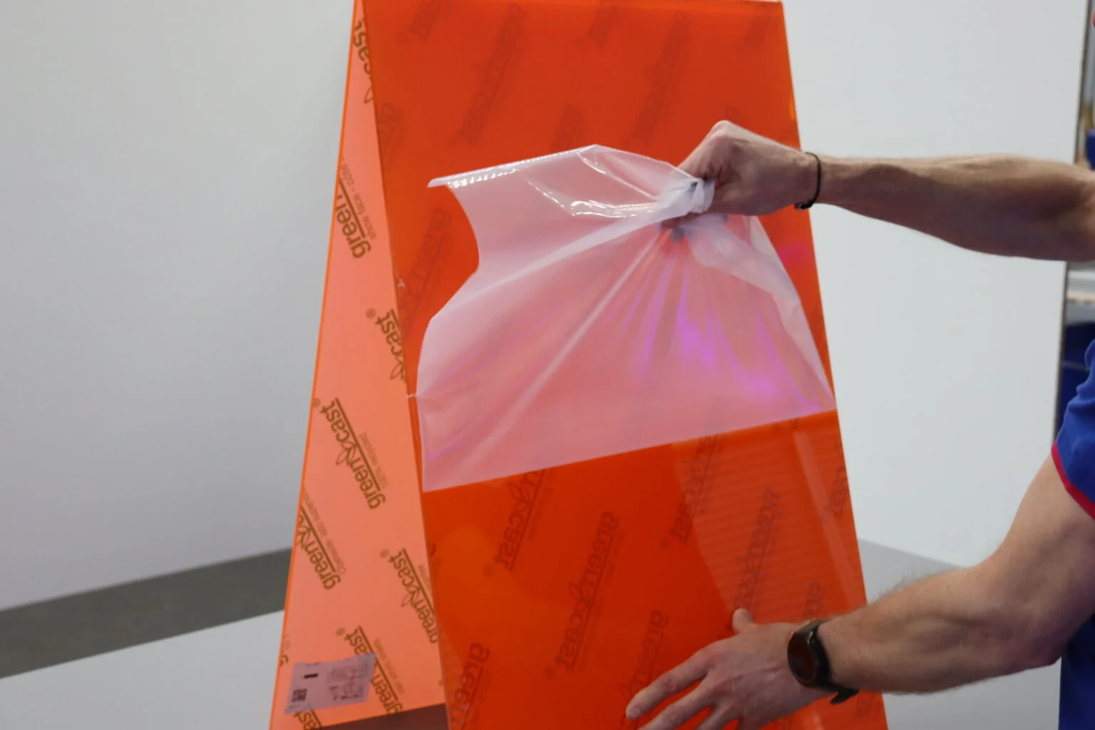 Standardowy potykacz reklamowy ma zagięcie pod kątem prostym, czyli pod kątem 90 stopni. Użyj kątownika, aby zagięcie było precyzyjne. Po wykonaniu gięcia poczekaj, aż płyta plexi ostygnie – zwykle zajmuje to kilka minut, w zależności od grubości płyty. Pamiętaj, aby do gięcia płyty założyć na dłonie żaroodporne rękawice ochronne.