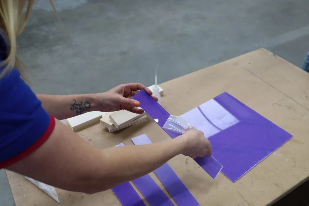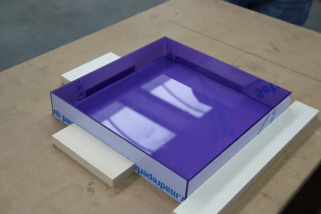 Klejenie płyt plexi wymaga precyzji. Daj sobie czas i pracuj starannie, aby rama była solidna i estetyczna. Zdejmij folię ochronną tylko z tych części, które będą klejone. Pozostała część folii chroni materiał przed zarysowaniami. Połóż tylną płytę na stabilnym podłożu. Upewnij się, że płyta leży płasko i że nie będzie się przesuwać. Przygotuj cztery bloczki z drewna. Posłużą one jako podparcie boków podczas schnięcia kleju.